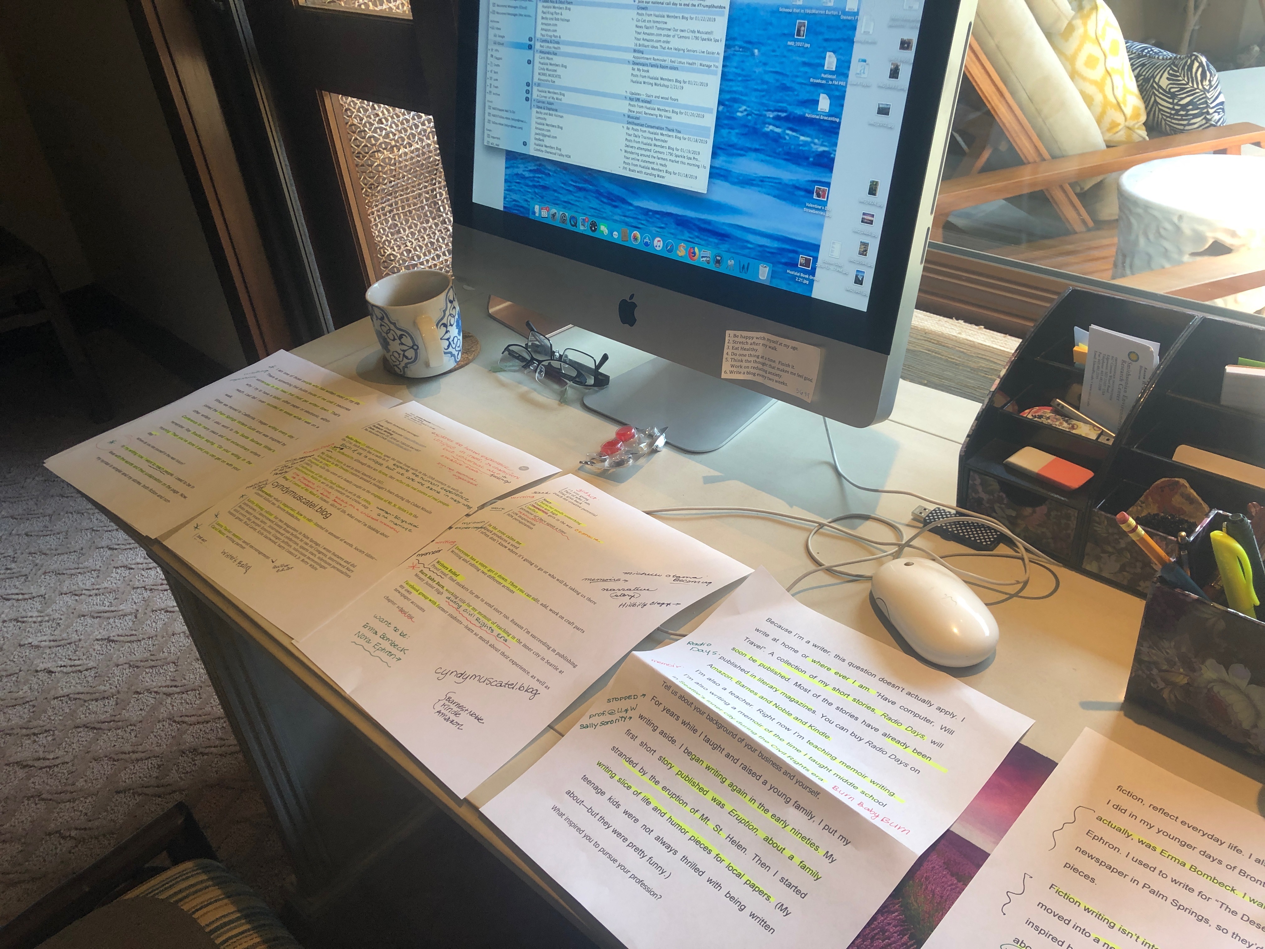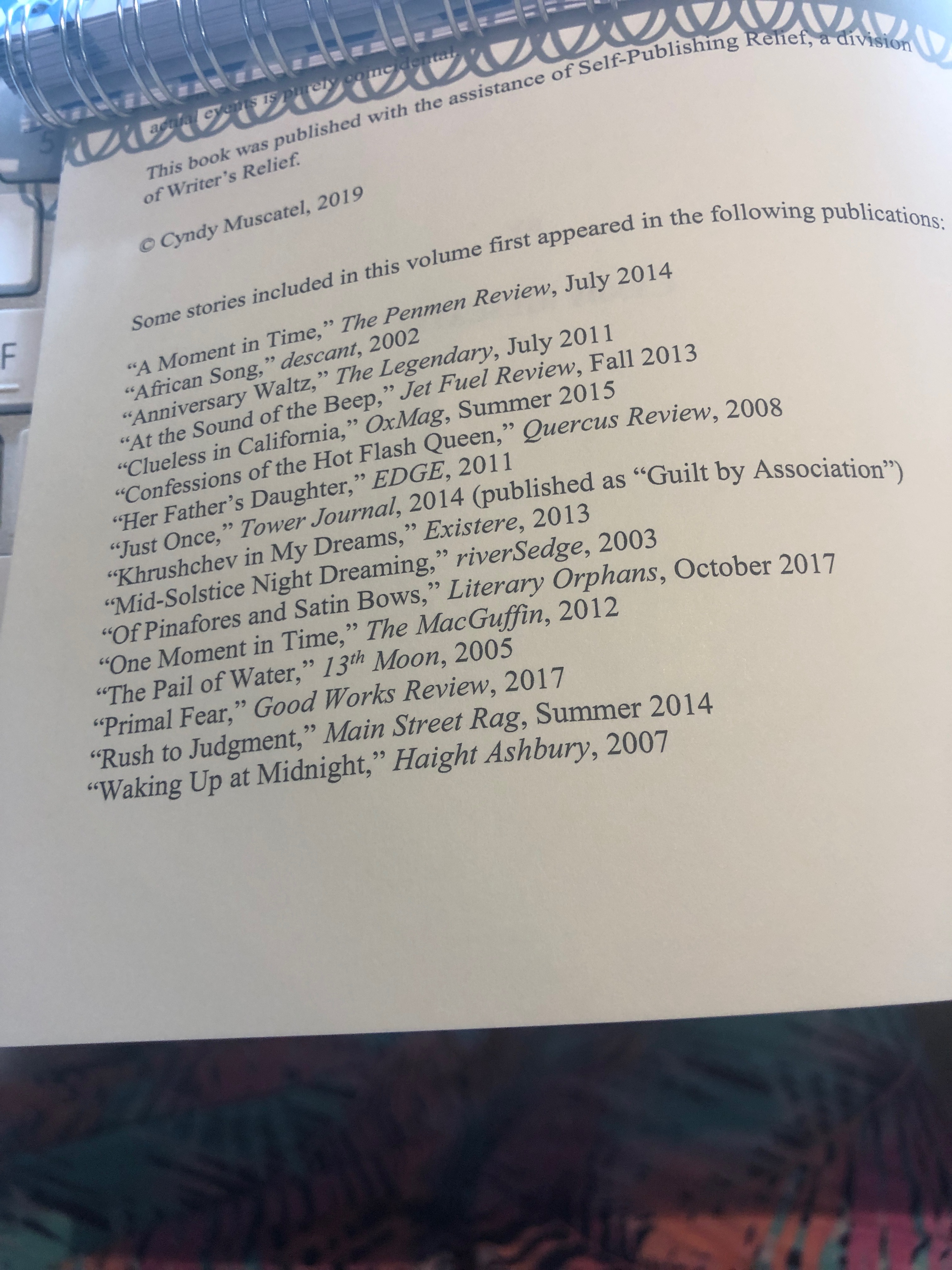 So I did the radio interview. I did a two-hour preparation for the eight minutes, consolidating and outlining my main points. I’m not much for promoting myself but I knew this was an opportunity to push Radio Days so I had half a page just on the book. Someone advised me to spread out the pages on my desk so I could see all of them at once, which I did. But the time went quickly; I didn’t have time to look at the color coded pages. Eight minutes goes so fast that I left some important things out. Like thanking Writer’s Relief for guiding me all these years.